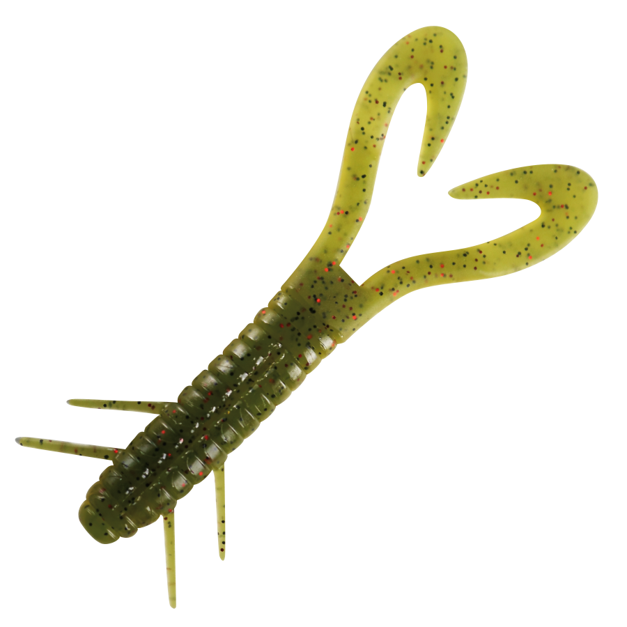 飛距離にもストレスを感じず、アピールも出せる85mmサイズ。狙ったのは「ヘビキャロの落ちパク」。垂直フォール時には、テールをバタつかせ魚にアピール。スローフォールでは、頭下がりのフォール姿勢で魚に喰わせる間をあたえる。基本のズル引きでも、4本の脚とテールの揺らぎで魚を誘う!