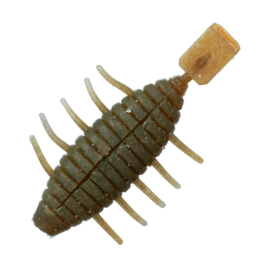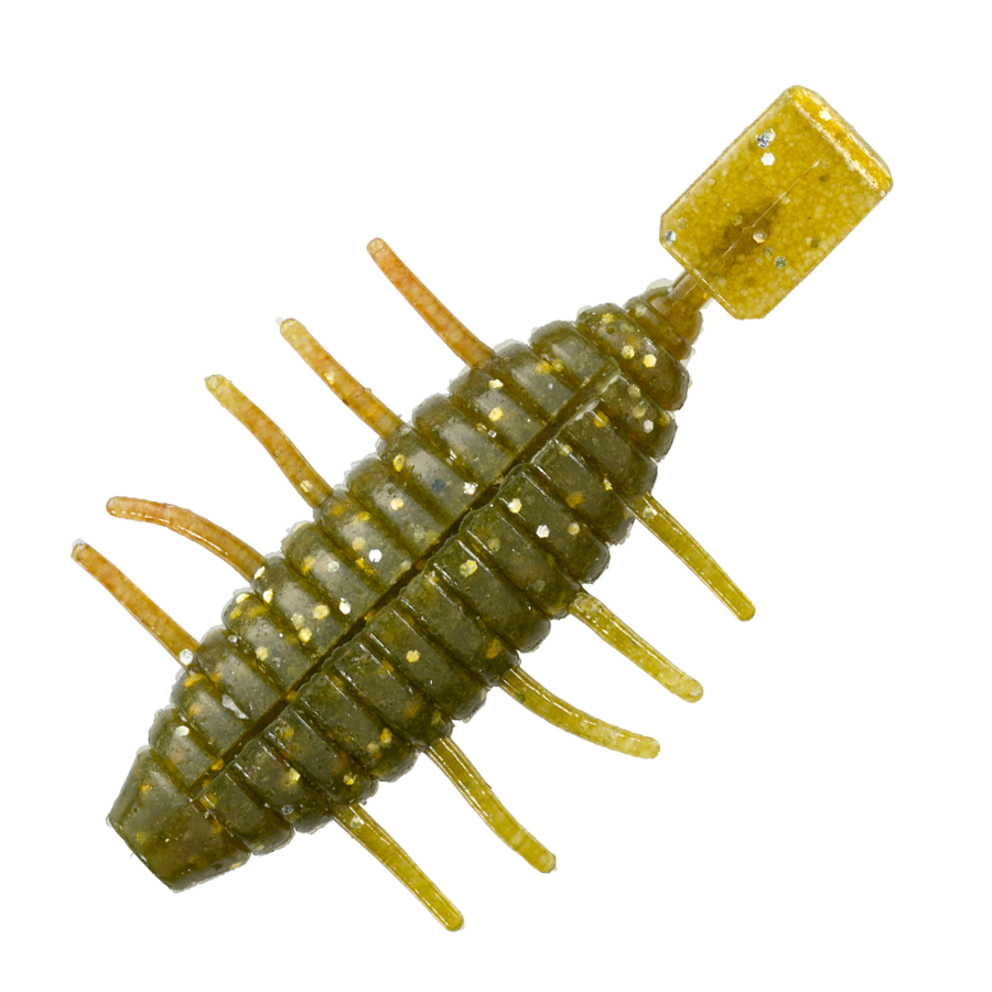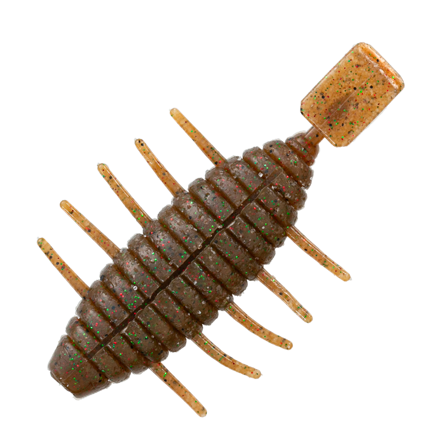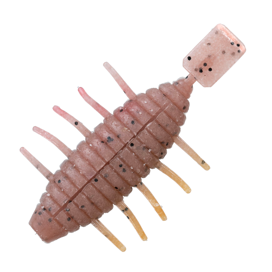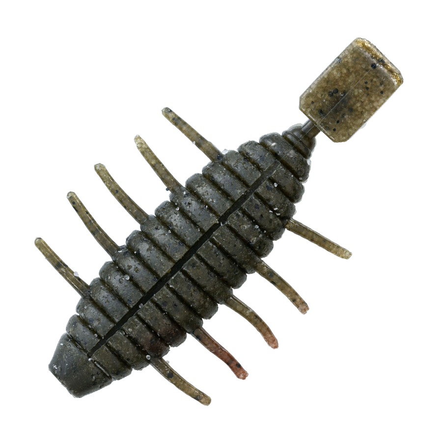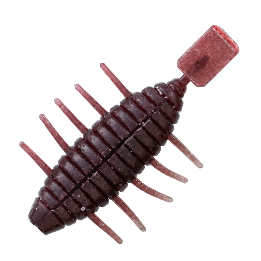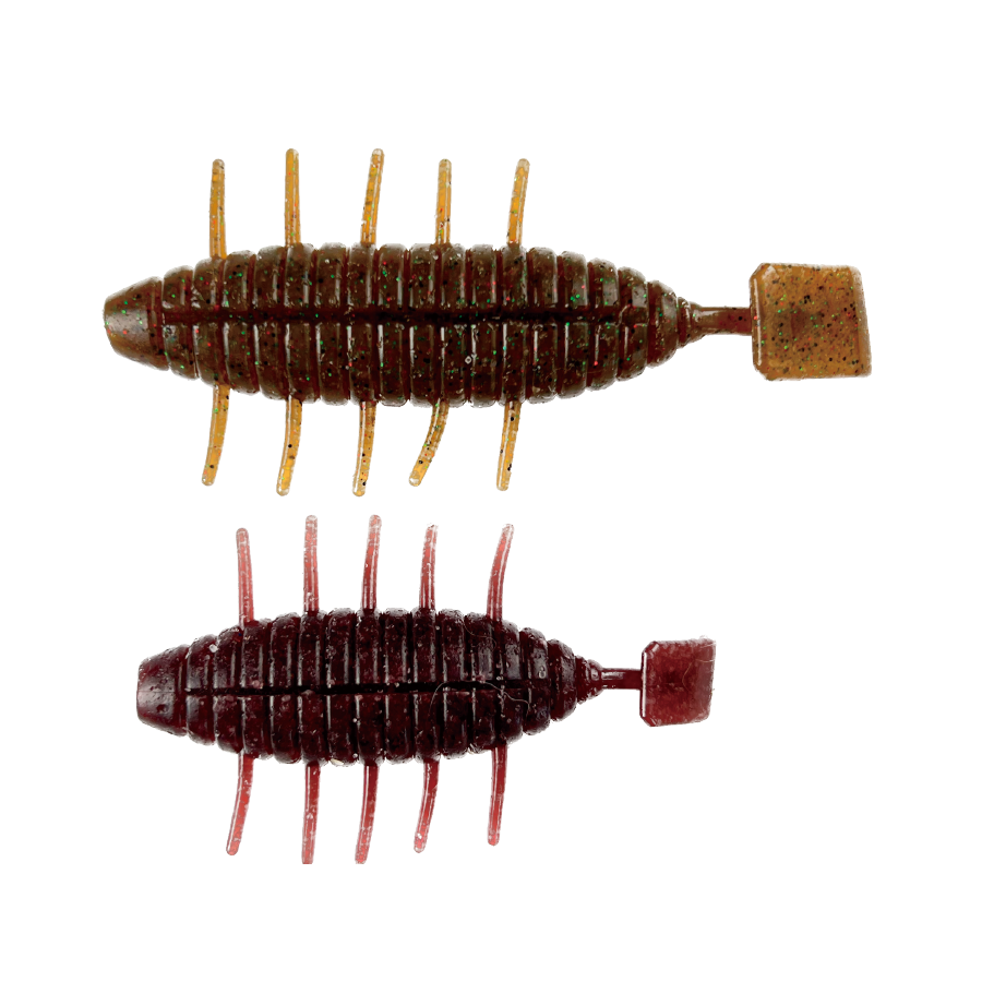 水平につけられたスクエアテールは水を受けて落ちる時に水押しを強調。アクション時においても、動いたり、動かなかったりとエビシャッドから受け継いだ意図しないイレギュラーな動きが釣れる要素になっています。高比重ノーシンカーにとっても重要な水押しの定番ボディだけでなく独特なテールで抜け押す水押しを付随させました。