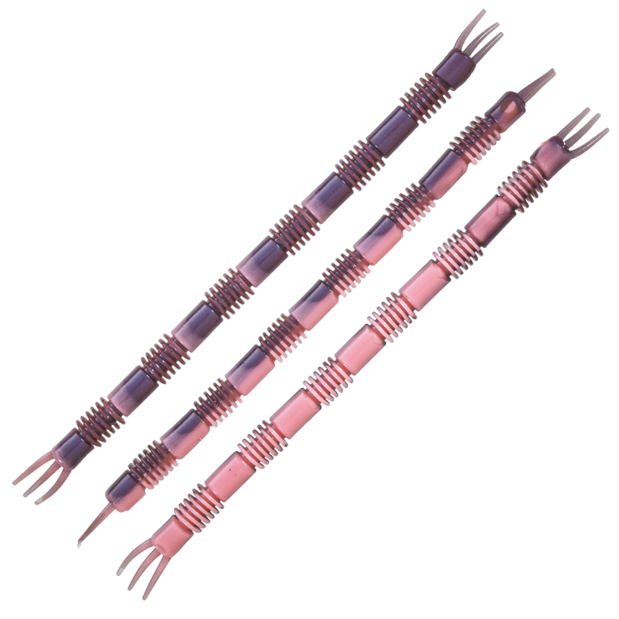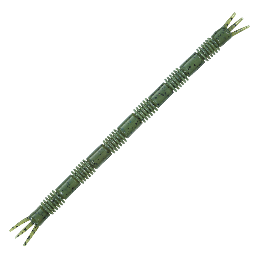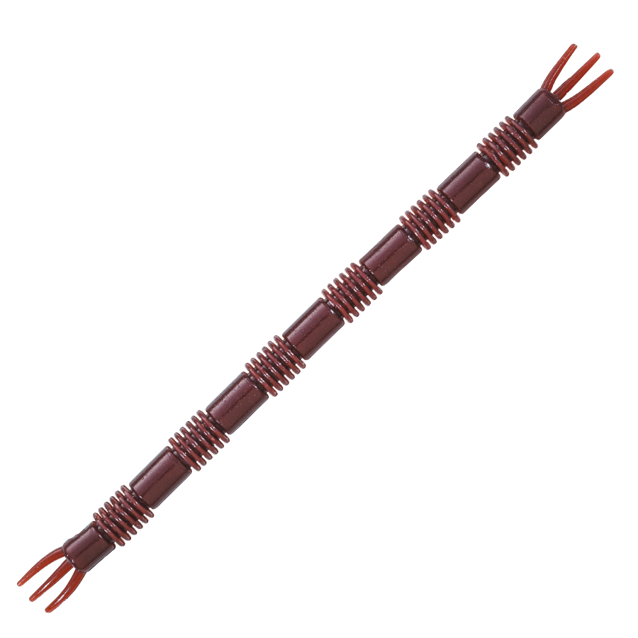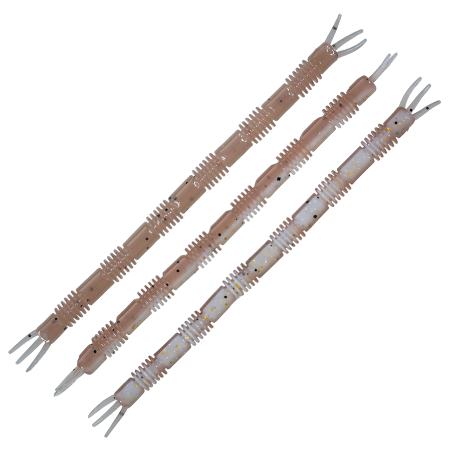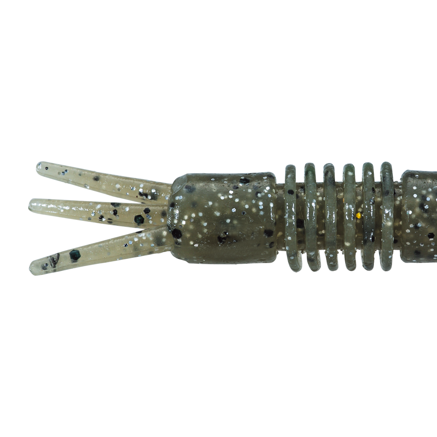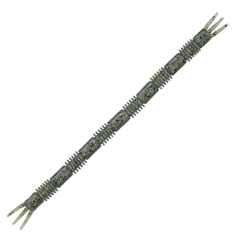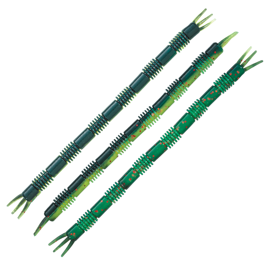 「リング系ワームは釣れる」「ストレートワームは根強く人気がある」そんな単純な発想から始まり、ストレートワームでありながらリング系リブの効果を重視した形状を考案。知り得る釣れるストレートワームの動きである、フォールによる揺れ、ジャーク時の震えが出るように長さや比重にこだわりました。最も汎用性が広いといえるストレートワームの釣れる要素をしっかりと詰め込みました。